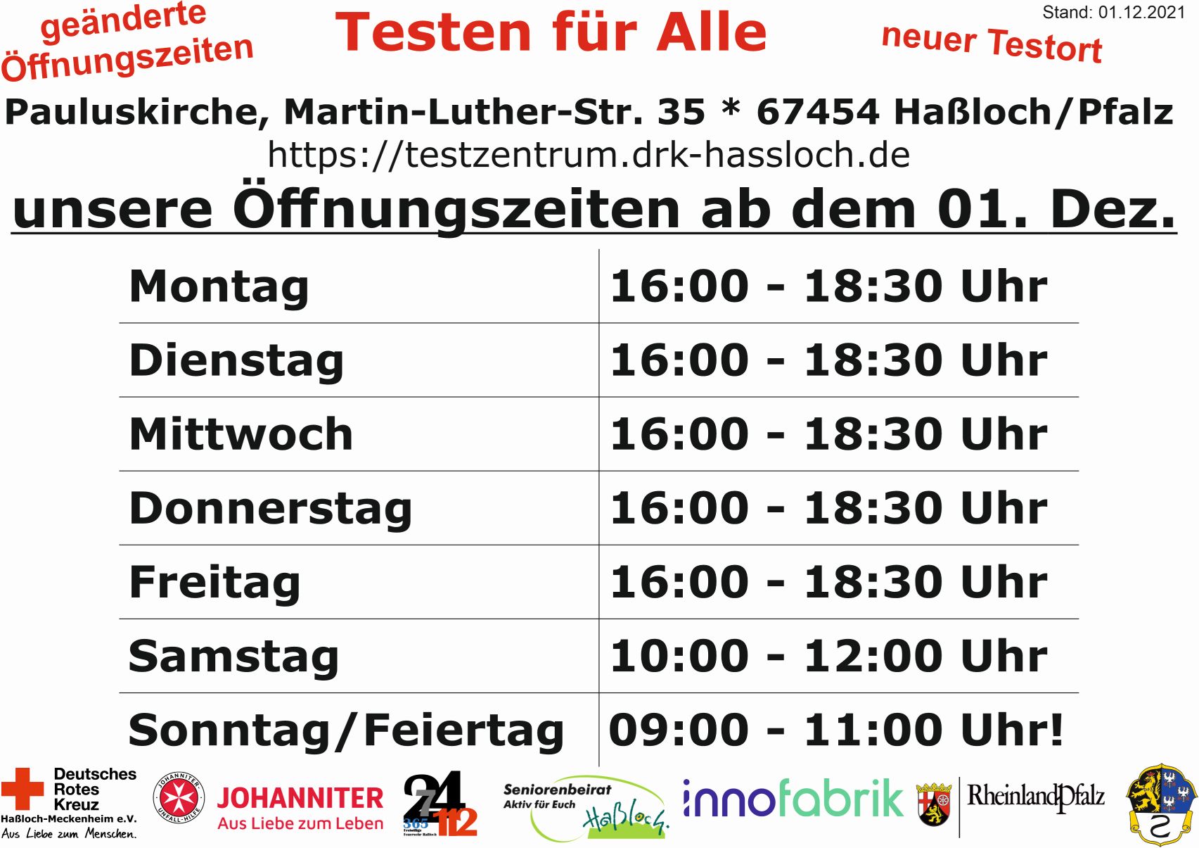 Das Schnelltestzentrum im Nebenraum der Pauluskirche, Martin-Luther-Str. 35 in Haßloch hat ab dem 1. Dezember 2021 wie folgt geöffnet: